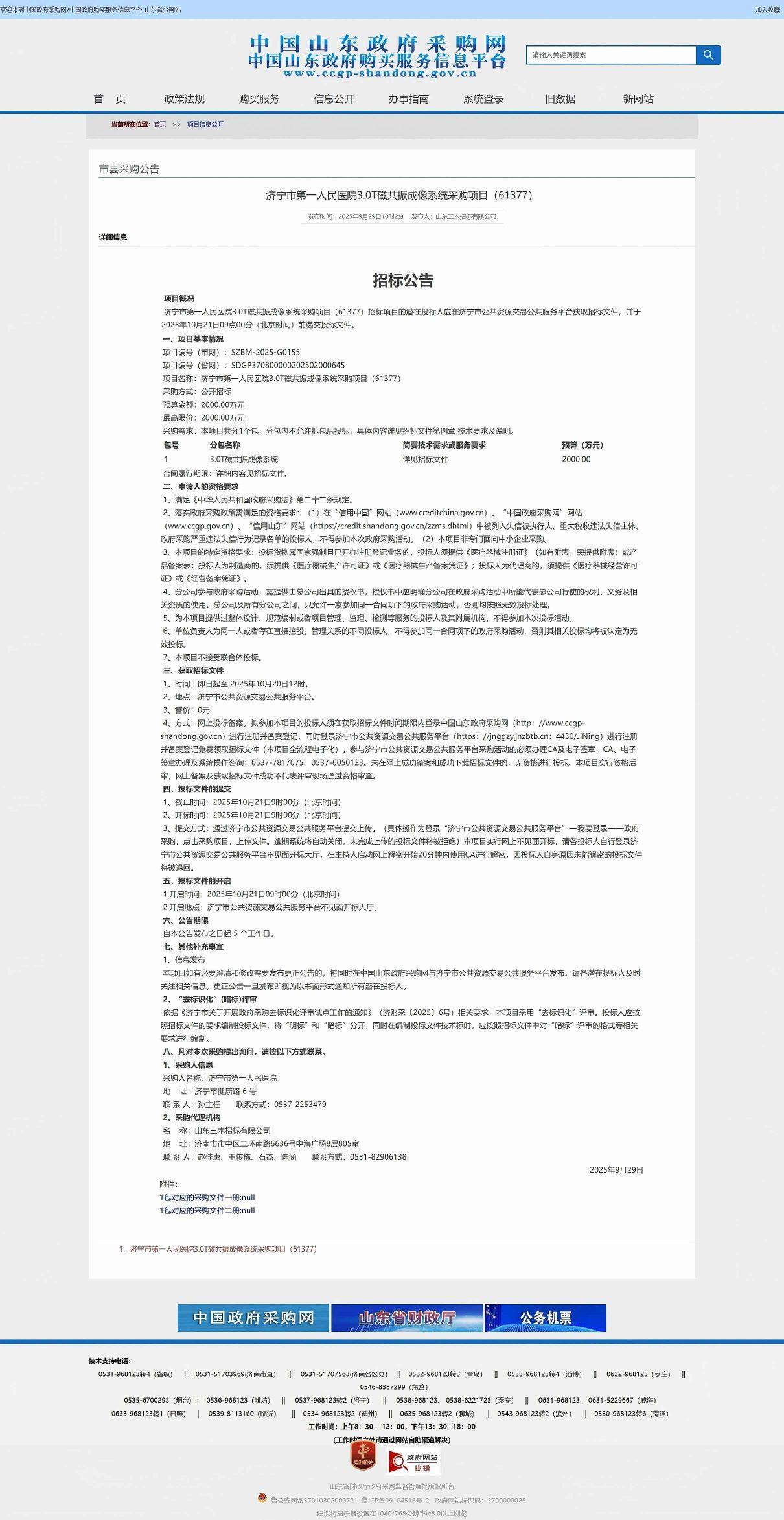 濟寧市第一人民醫(yī)院3.0T磁共振成像系統(tǒng)采購項目(61377)招標公告