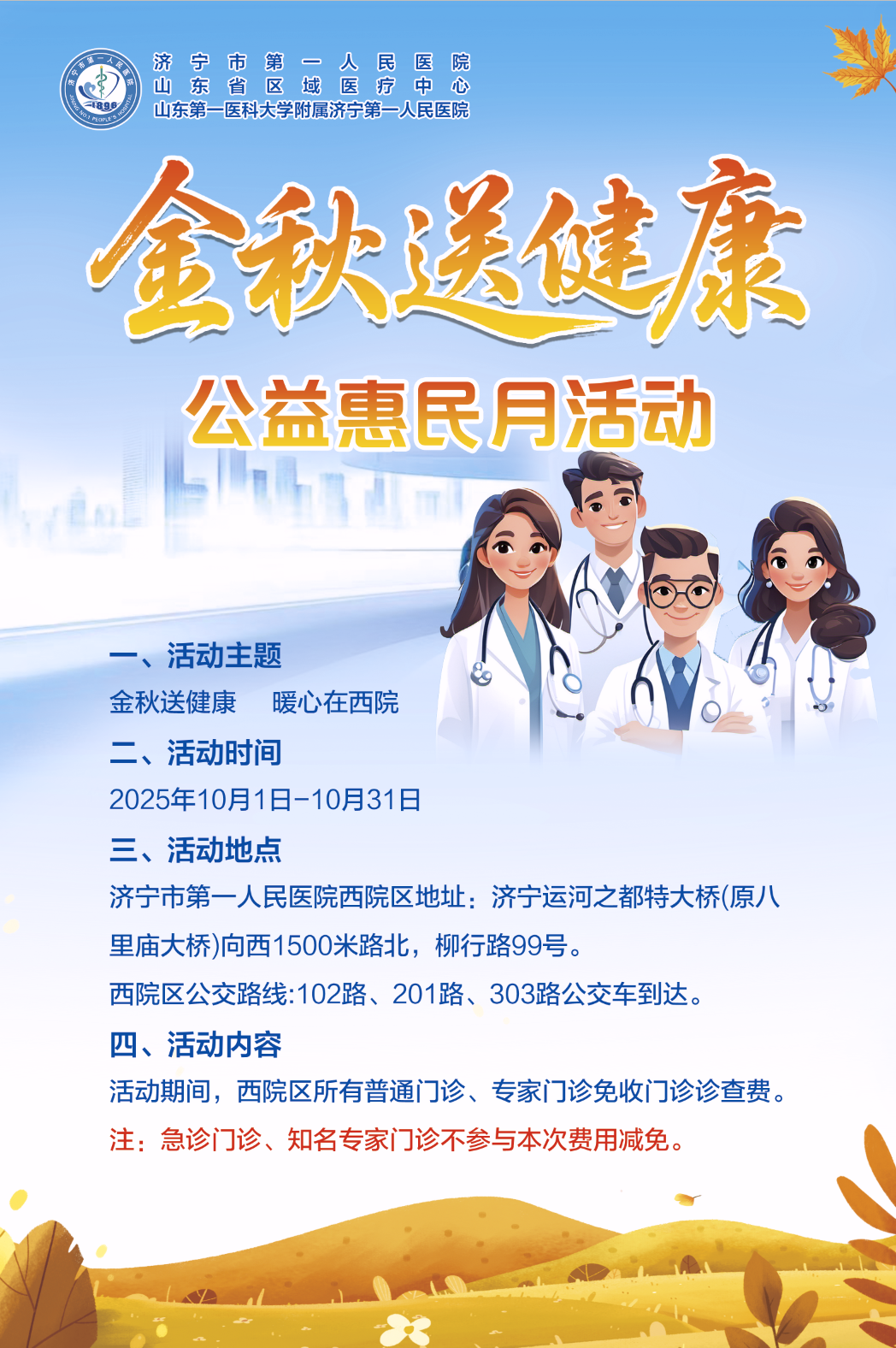 濟(jì)寧市第一人民醫(yī)院西院區(qū),邀您共赴“金秋送健康”之約,暖心服務(wù)不停歇,只為守護(hù)每一位市民的健康!